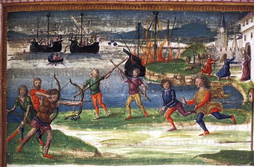 Book Five gives way to celebration and destruction for Aeneas and his men. They travel further into the ocean and the winds pick up so Palinurus, the pilot, recommends they head for Sicily, Acestes land. After landing Aeneas brother, Acestes, greets them. Aeneas recommends having funeral games for his father Achises whose bones were laid to rest on the land. These plans are put into effect and preparations begin for the games. Before the games begin sacrifices are made in order to help Achises' spirit. People come to the games for the chance to see Aeneas and his men on top of the excitement of the games. The first event is a boat race. After some "smooth" sailing prizes are given out to the first, second and third place boats. A foot race, the second event, is started and ends in some controversy. When a runner that tripped unintentionally trips another in order to gain placement, the hinder contestant complains. Aeneas firmly states that the prizes are set but he gives a consolation prize to the cheated competitor. The third event is boxing. The underdog, Entellus, wins with the help of the gods. Archery is the fourth event. Acestes is the oldest contestant and still